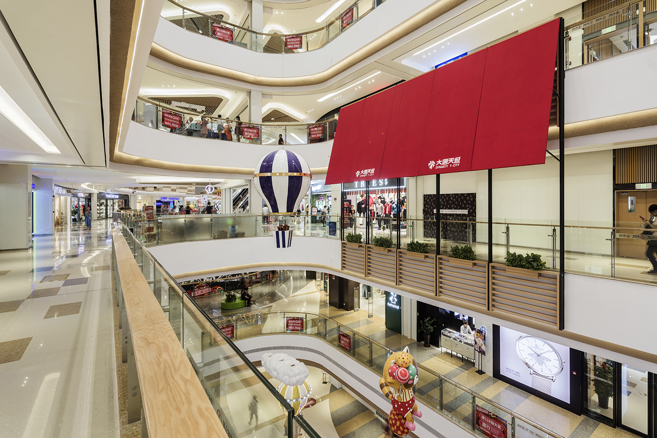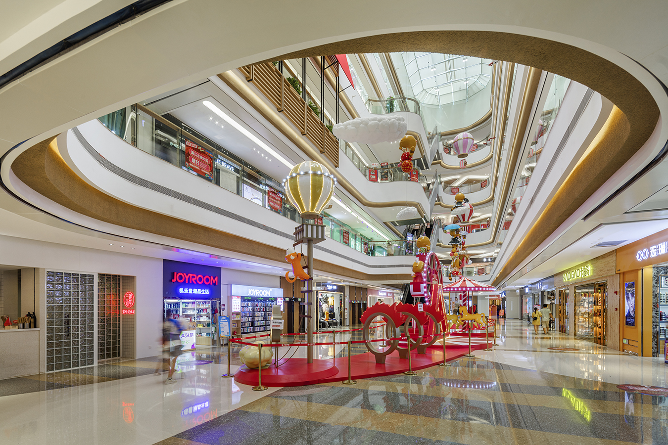 “大椭圆”环状空间分布是经典的商业设计,GLC从基础布局中做到了新突破,全玻璃屋顶加上每层的柔和环形灯带,勾勒出极具秩序的线条,软装上又以卡通的云朵、热气球、飞机缤纷色彩融合进去,平衡有趣。